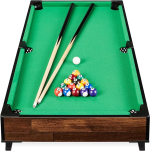Comes equipped with two cue sticks for one-on-one game play, chalk, a set of balls, a racking triangle for clean breaks, and even a felt brush for easy upkeep; OVERALL DIMENSIONS: 40"(L) x 21.5"(W) x 8"(H)